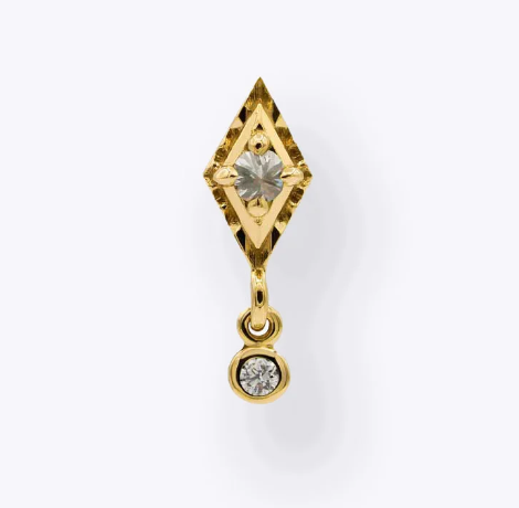 Step into a world of refined sophistication with the Dyna Drop, a 9.5mm long threadless end meticulously hand-crafted from 14K gold. Inspired by the imposing grandeur of medieval shields, this exquisite piece features multiple Diamonds. What sets this drop variation of our signature Dyna end apart is its striking silhouette and multi-dimensional texture, a 1.5mm reverse-set Diamond and a 1mm bezel-set matching drop that captures each subtle movement.