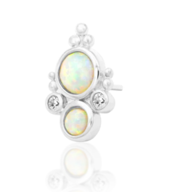 Oh viva, Nevada! A regal pair of Faux white opals (3mm and 2mm) and a pair of 1mm sparkling CZs in a solid gold bezel setting, sprinkled with delicate gold bead detailing.