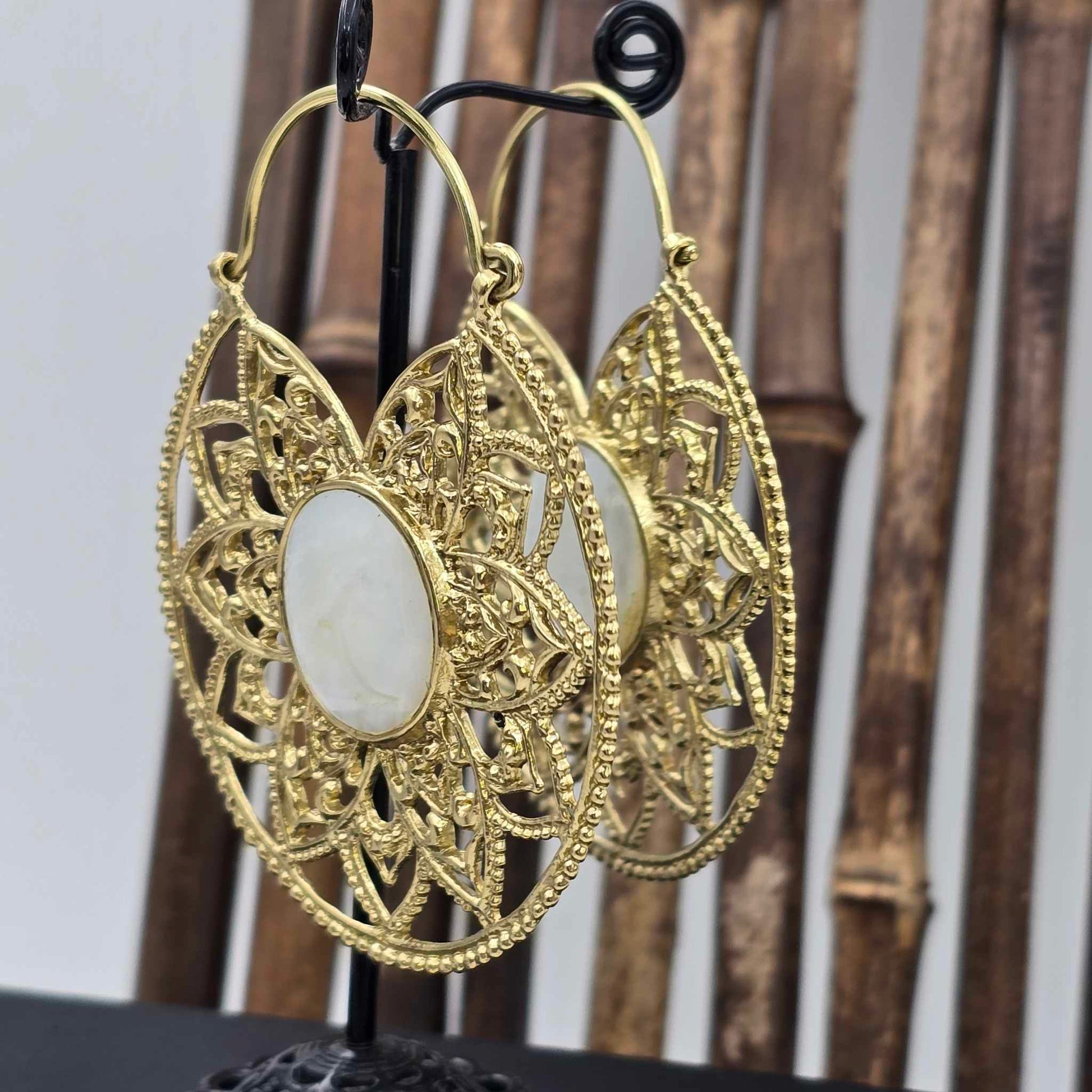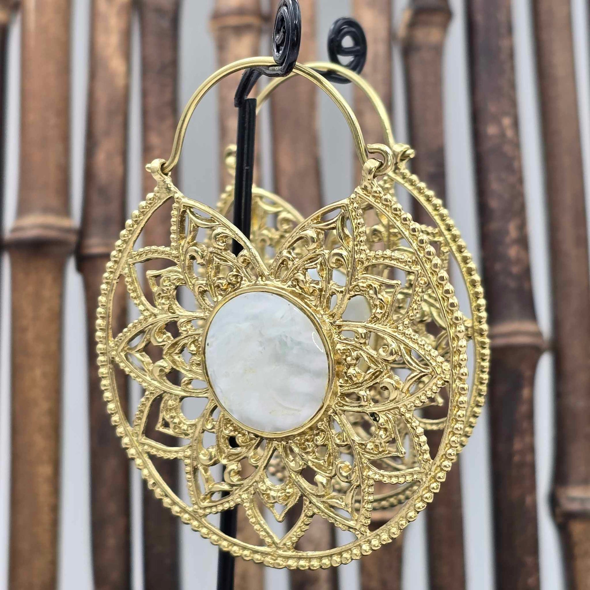 These stunning hangers are sure to capture attention. A mandala of brass surrounding a charming pearl inlay you'll love how you feel wearing these!