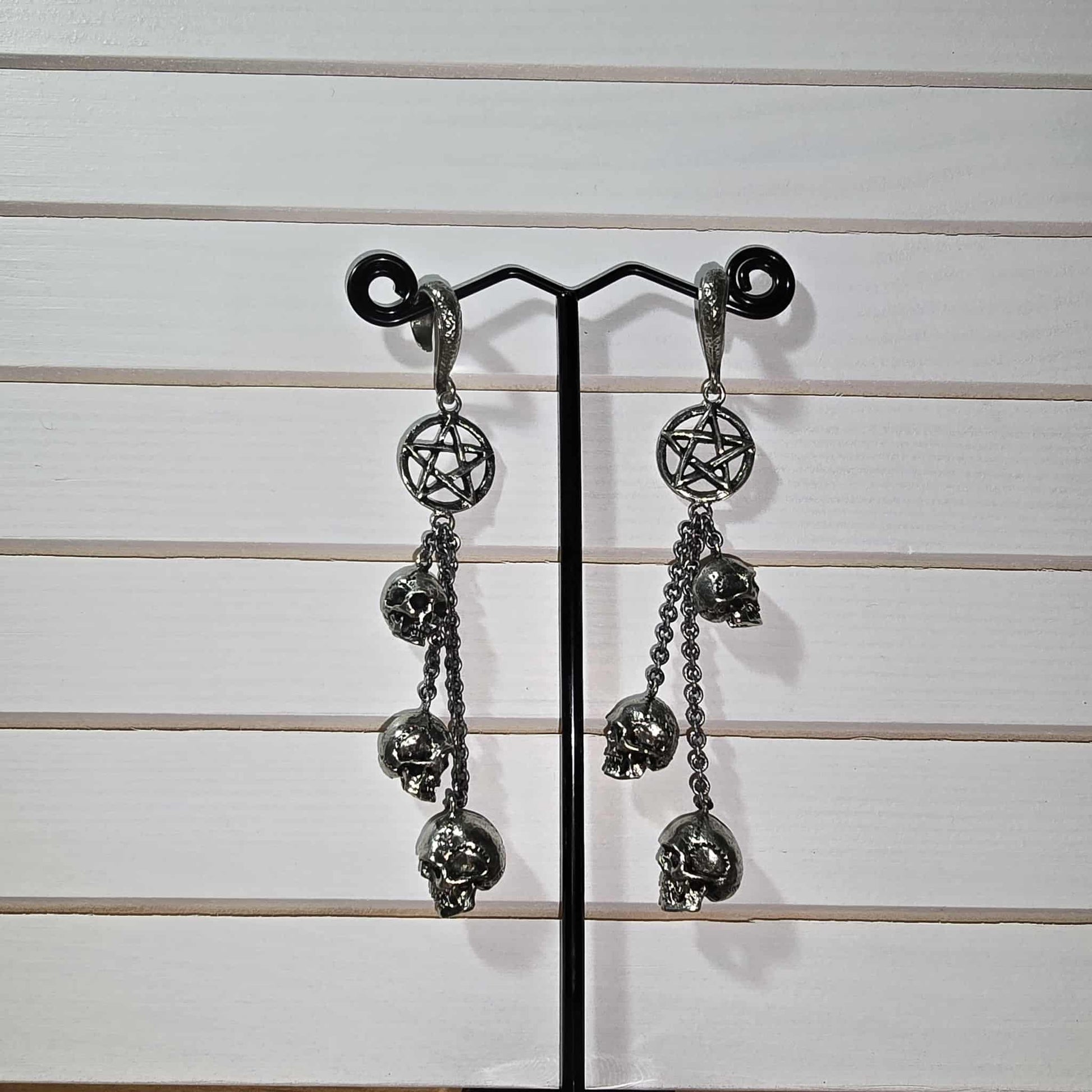 Elevate your style with these Triple Skull Pentagram Earrings, handcrafted from high-quality brass and copper for a bold, edgy vibe. Perfect for everyday wear or special occasions, their 2 1/2" hanging design adds a striking flair to your ear lobe piercings. Lightweight for all-day comfort and easy to insert, these textured hangers blend durability with rebellious charm. Trust in their artisanal craftsmanship to make a statement wherever you go.